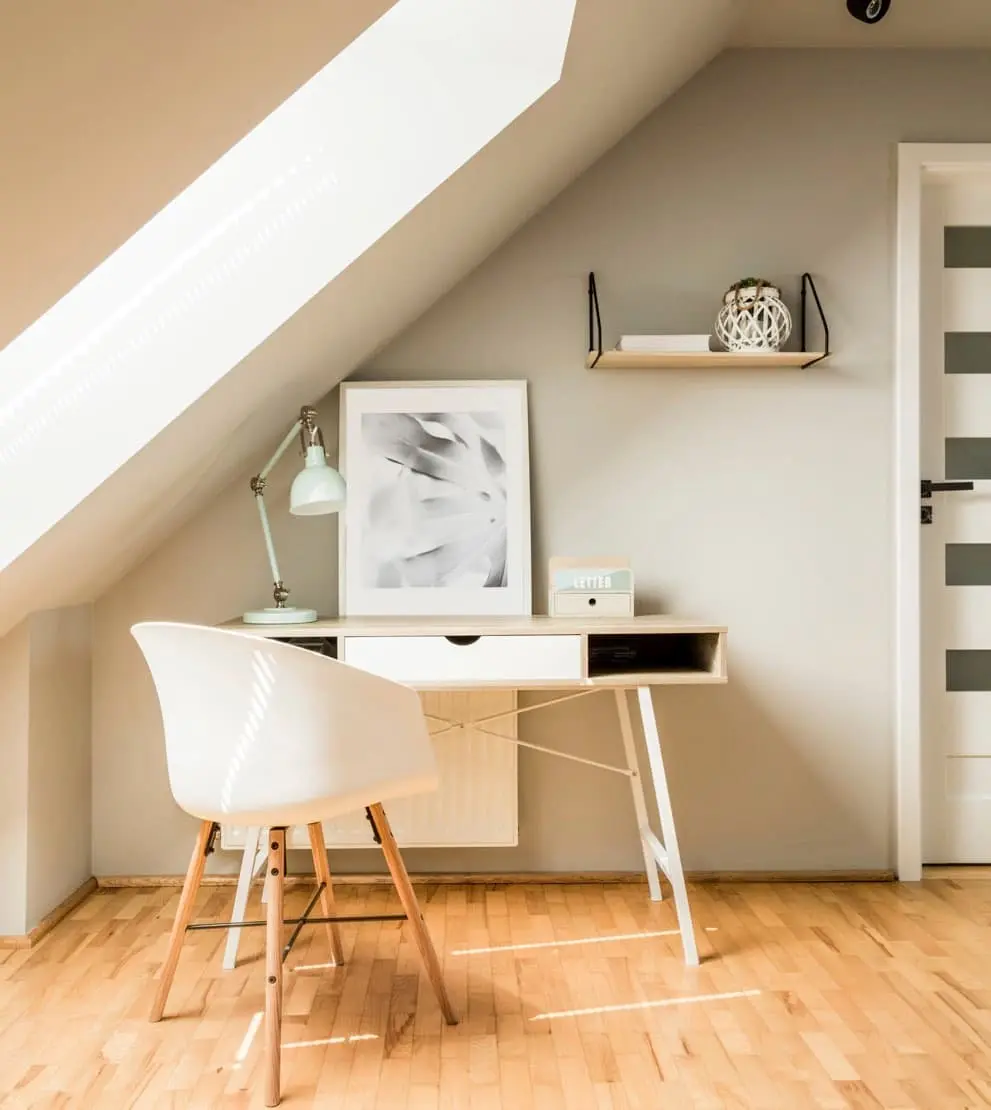 Een van de meest vergeten ruimtes in huis is de zolder. Met een beetje opruimen kun je er een rustige en afgezonderde werkplek creëren. Plaats een bureau bij een raam voor natuurlijk licht en frisse lucht en denk aan goede isolatie om de temperatuur het hele jaar door comfortabel te houden. Belangrijk is wel dat je je werkhoek duidelijk scheidt van eventuele opslag, zodat je écht een kantoorgevoel krijgt.