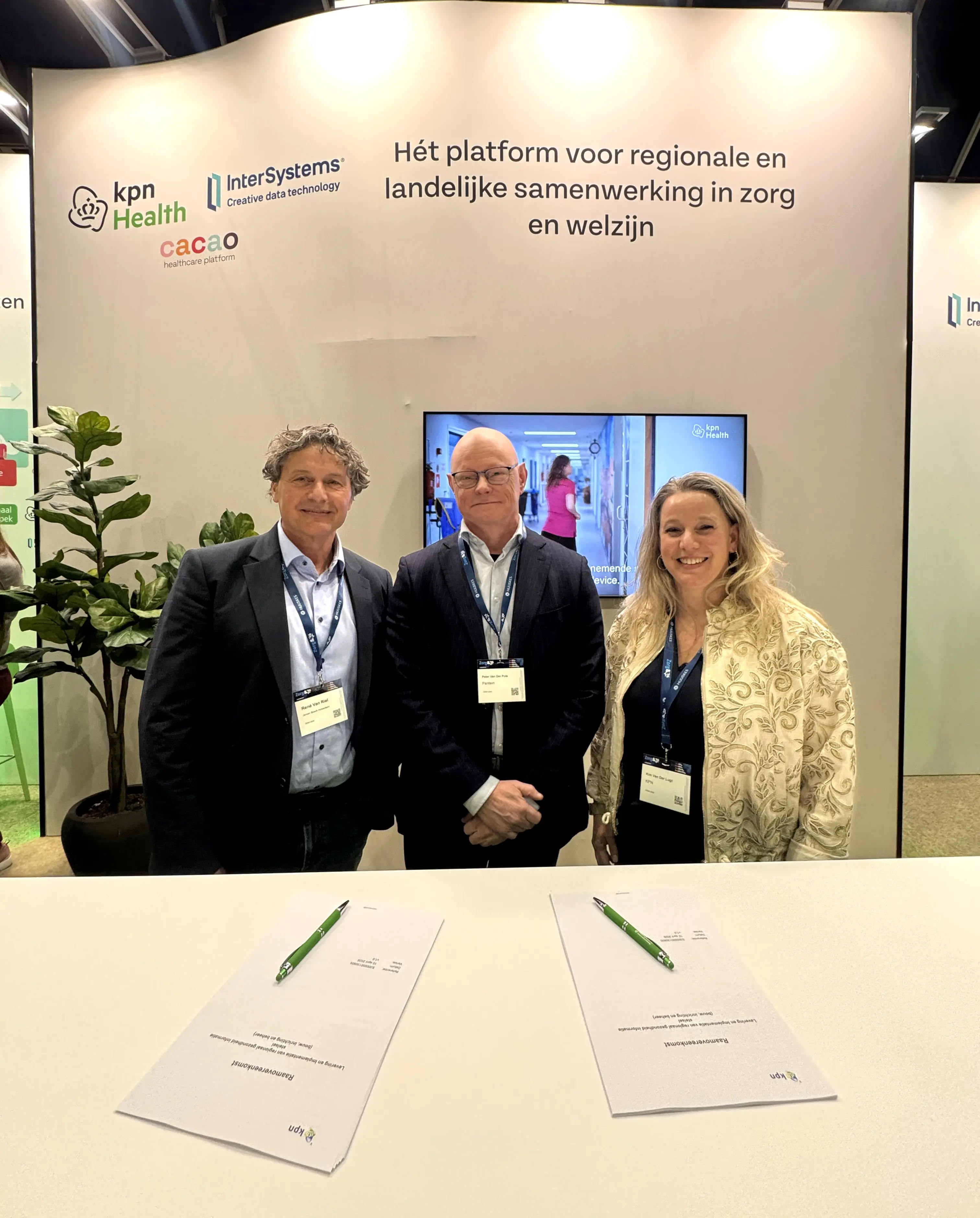 Op de foto (v.l.n.r.): Rene van Riel (directeur bedrijfsvoering bij Jeroen Bosch Huisartsen en bestuurder bij ZorgZaam), Peter van der Pols (bestuurder bij Pantein Zorggroep, namens MooiMaasvallei), Kim van der Lugt (VP KPN Health)